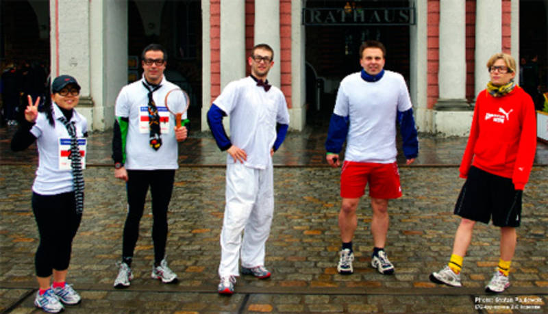 Despite of drizzle, awkward wind and cold 8°C, the international staffing team "SBI Magic 5" competed for the 5x3km run. Under the applause of the audience, Angelyn Lao, Wencke Walter, Dr. Julio Vera Gonzales, Ulf Liebal and Andreas Frost started the competition against the clock and the other attendees. Because the relay should also work as a commercial for the sport and should also entertain the visitors on the track, all teams devised a special theme. The runners of the SBI therefore tried to fit some of the stereotypes of computational and mathematical scientists by wearing nerdy glasses, tie or ribbon and an oversized magnifier as a baton. The SBI relay finished their rounds in 1h13min and proved that a healthy mind and a healthy body form one unit.