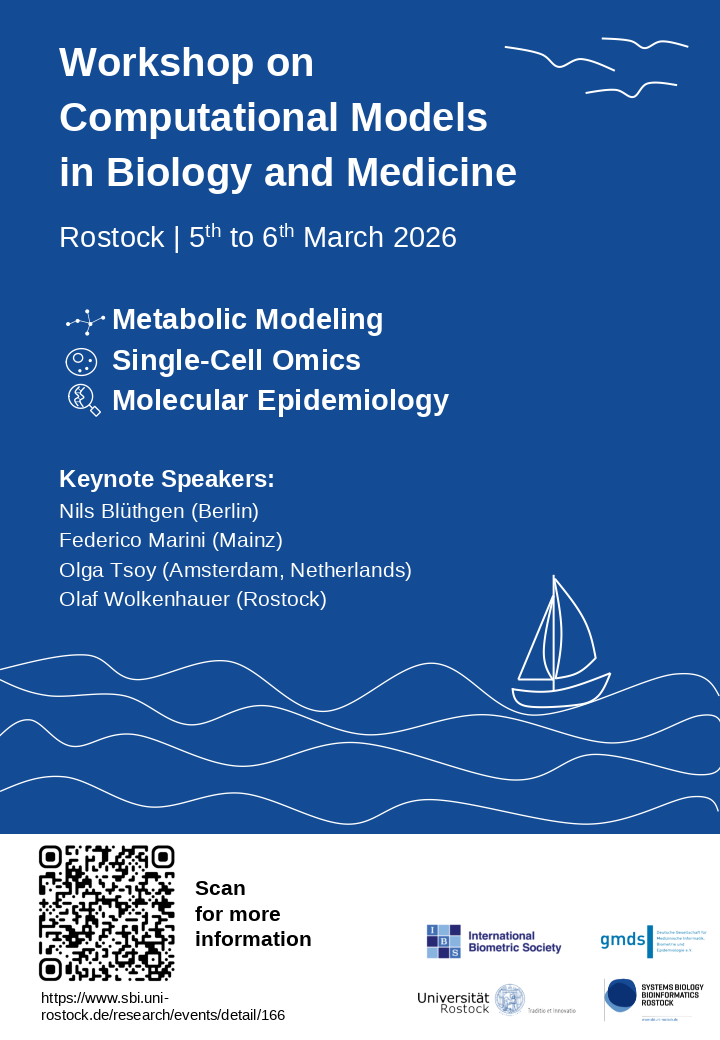 The workshop is jointly organized by the GMDS/IBS working groups "Statistical Methods in Bioinformatics" (Tim Kacprowski, Technische Universität Braunschweig; Michael Seifert, Technische Universität Dresden) and "Mathematical Models in Medicine and Biology" (Nicole Radde, Universität Stuttgart; Ingmar Glauche, Technische Universität Dresden), as well as Alexandra Baumann (Universität Rostock) as a local organizer (contact).